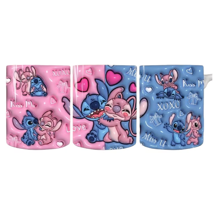 Această cană personalizată cu Stitch și Angel transmite dragoste și căldură la fiecare înghițitură.